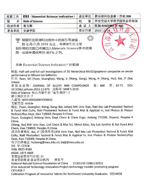 根据教育部科技查新工作站的检索证明,ac米兰化学化工学院教师袁光辉以第一作者发表的论文《Half-cell and full-cell investigations of 3D hierarchical MoS2/graphene composite on anode performance in lithium-ion batteries》被Essential Science Indicators(ESI)归入材料科学领域同一出版年最优秀的前1%之列。这是ac米兰迄今为止第一篇进入ESI的科技论文,也标志着ac米兰材料科学研究水平达到了一个新的高度。