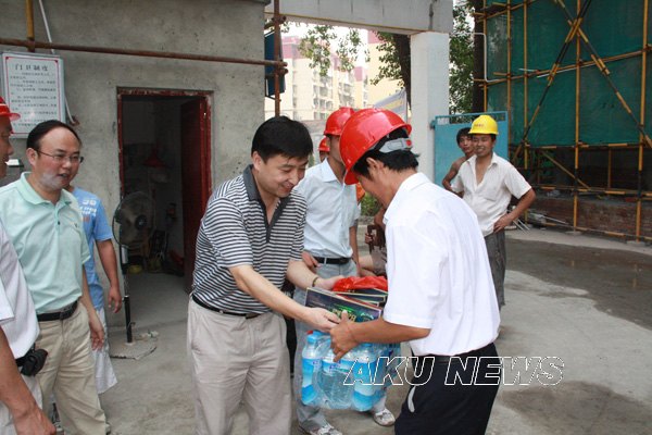 7月22日上午,学院党委书记杨涛、副院长杨行玉在基建处处长王平、兴科建筑公司项目部经理胡崇斌的陪同下,来到我院新建学生公寓楼建设工地,慰问正在现场紧张作业的工人师傅。杨涛、杨行玉为工人师傅们递上了矿泉水、烟等慰问品,为大家送上了一份烈日中的关爱和清凉。