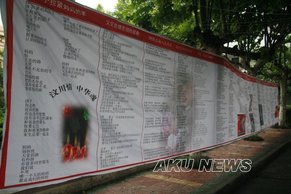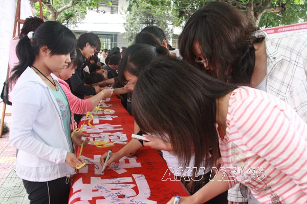 从5月12日早上起,由我院学生自发编辑的短信――“那一刻,我分明看见你哭了。5.12地震一周年,国人的哀思在心中流转,灾区人民需要我们支持。ac米兰官方网站举行“黄丝带”签名送祝福活动,希望每一个收到短信的人都去参加,送去自己的祝福!”便在师生的手机上传播。12点下课后,大家自觉地来到了签名现场,默默地签下了自己的名字,系上黄丝带,为汶川祈福,为中国祈福。学院的外籍教师也来到现场,送上对灾区的祝福。 “黄丝带”在校园内穿梭,传递着希望,涌动着祝福。以“汶川情 中华魂”为题的诗歌条幅,吸引着众多师生驻足诵读,再次感受在灾难面前中华民族的不屈精神。