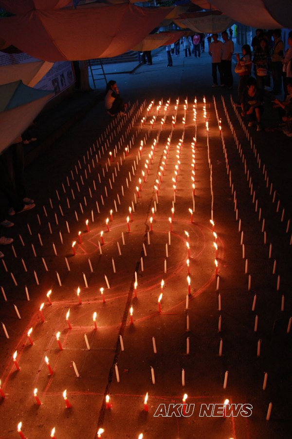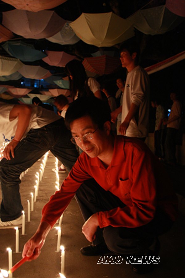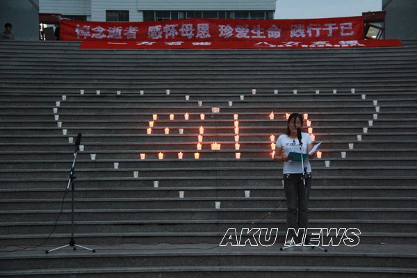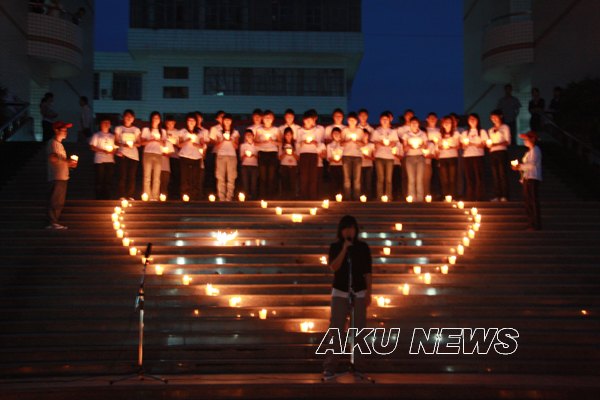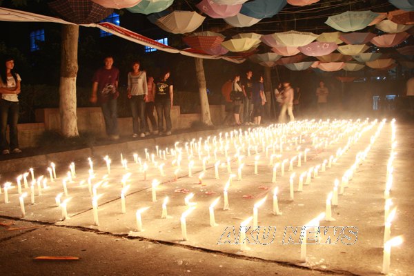 晚上7:00,由大学生记者团、青年志愿者服务队组织的“悼念遇难同胞诗歌朗诵会暨默哀仪式”在东校区一号教学楼前举行。同学们用一首首诗歌传递着对灾区人民的浓浓爱意。一名来自四川灾区的同学点燃了第一根蜡烛,将这汇集了哀思与祝福的蜡烛传递到了师生手中,瞬时,烛光聚成了一个大大的心形,代表着ac米兰官方网站人和灾区人民心连心。
