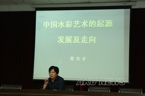 党天才教授的报告分为五个部分:一、水彩画的概念;二、水彩画的起源及发展;三、水彩画的发展趋势及走向;四、水彩画面临的噬待解决的问题;五,中外优秀水彩名作与党天才作品欣赏。