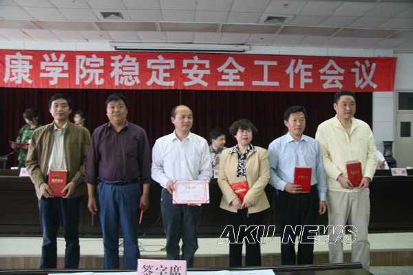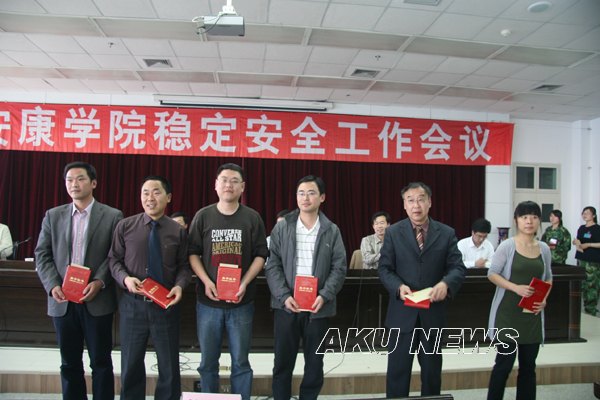 胡鸿晓宣布了学院关于表彰2008年稳定安全工作先进集体、先进个人的决定。2008年,我院稳定安全工作紧紧围绕建设合格本科院校的中心工作,以维护校园政治稳定为目标,以创建平安和谐校园为载体,以目标管理为手段,加强法纪教育,强化校园整体防范能力,各部门按照学院稳定安全目标管理责任书的要求,结合工作实际,开展了许多有创新有特色的工作,涌现了一批先进集体和先进个人,为维护学院稳定安全工作做出了积极贡献。为了表彰先进,树立典型,促进学院稳定安全工作,学院党委研究决定对政治与历史系等7个稳定安全工作先进集体、李延福等26名稳定安全工作先进个人以及获得安康市公安局2008年经济文化保卫工作优秀单位学院保卫处、荣获省市2008年稳定安全工作先进个人高立平等4名同志予以表彰奖励。