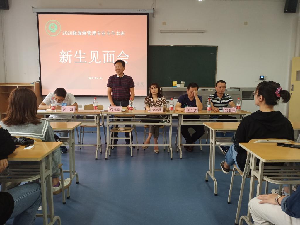 白露虽至,秋日暖阳。9月5日-6日,我院2020级旅管专升本班新生顺利完成了新生报到流程,正式成为旅环学院新的一员。为了尽快地帮助新生同学们适应新环境,了解我院的基本情况和专业特色,9月8日下午,我院召开了2020级旅管专升本班新生见面会。我院党总支书记张立虎,副院长储玖琳、郭全忠,旅游管理系专业老师刘智兴,20级旅管专升本班近60名新生出席了此次见面会。20级旅管专升本班辅导员孙凯主持了会议。