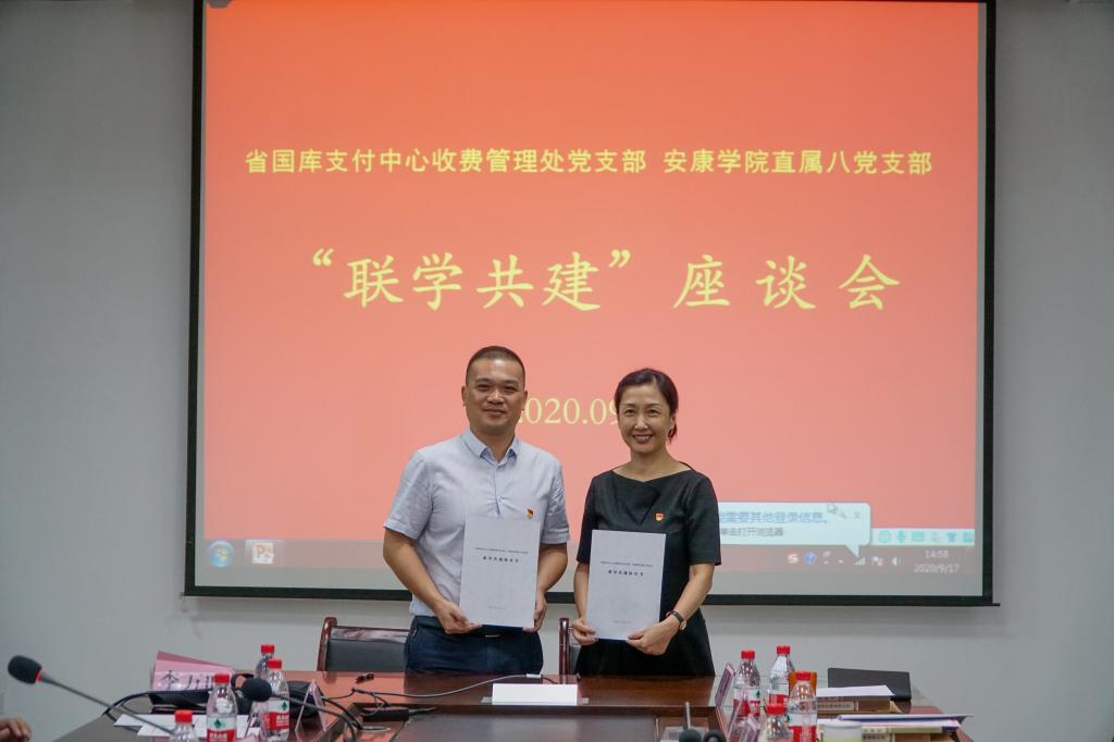 9月17日,两个支部“联学共建”协议签订仪式暨党建工作座谈交流会在江北校区逸夫科技楼九楼会议室举行,ac米兰官方网站党委副书记杨行玉,党委组织部部长屈险峰,发展规划处处长、家风家训研究专家戴承元出席会议。省财政厅国库支付中心收费管理处处长、党支部书记陈虹一行13人、直属八党支部部分党员和支部校内共建单位艺术学院党总支班子成员、部分党员教师参加了座谈会。