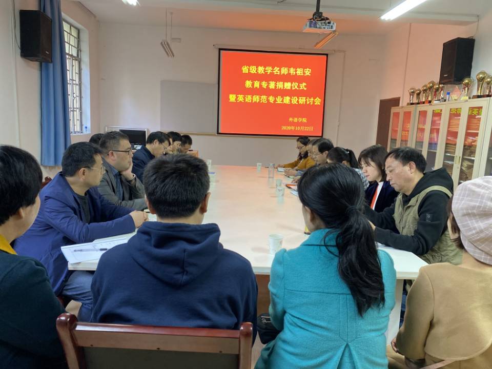 10月22日,汉滨高中原副校长、省级中小学教学名师韦祖安教育专著捐赠仪式暨英语师范专业建设研讨会在ac米兰举行。韦祖安教学团队、ac米兰外语学院党政领导班子及教师教育教学团队全体成员参加了会议。