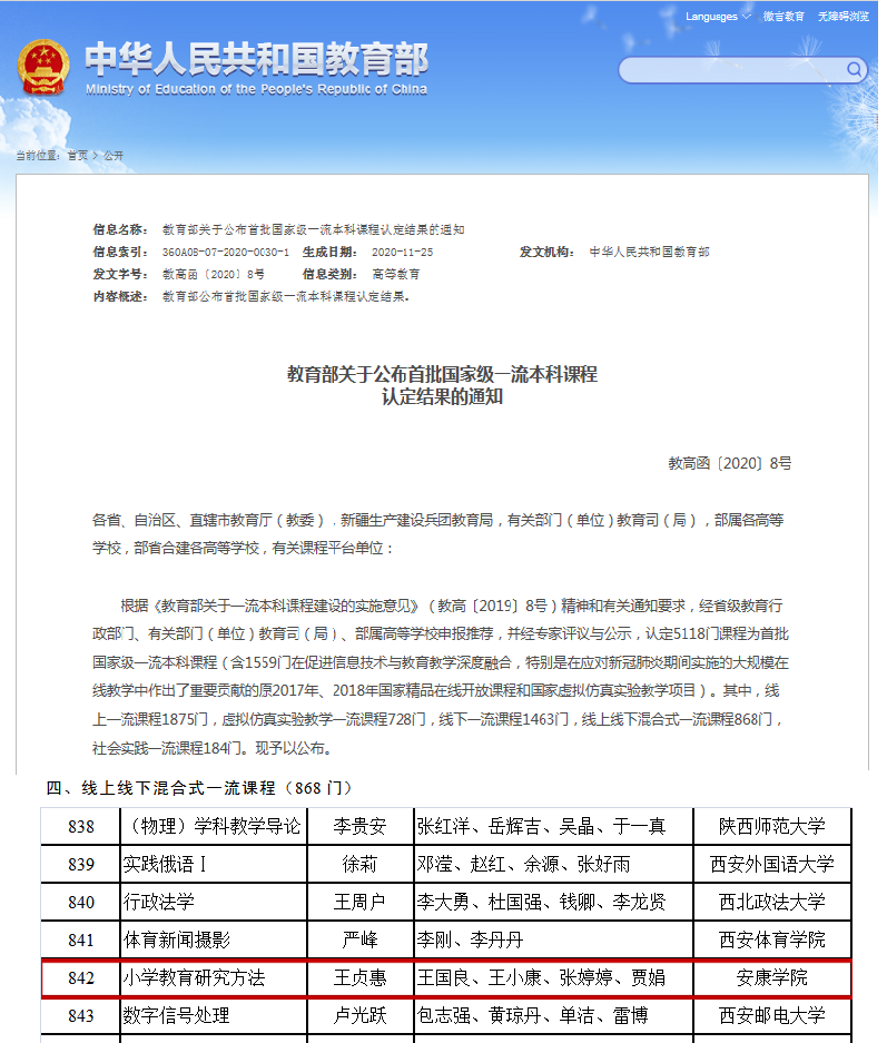近日,教育部公布了首批国家级一流本科课程认定结果。ac米兰教育学院教师王贞惠负责的《小学教育研究方法》被认定为首批国家级线上线下混合式一流本科课程,标志着ac米兰在国家“双万计划”中取得重要突破。