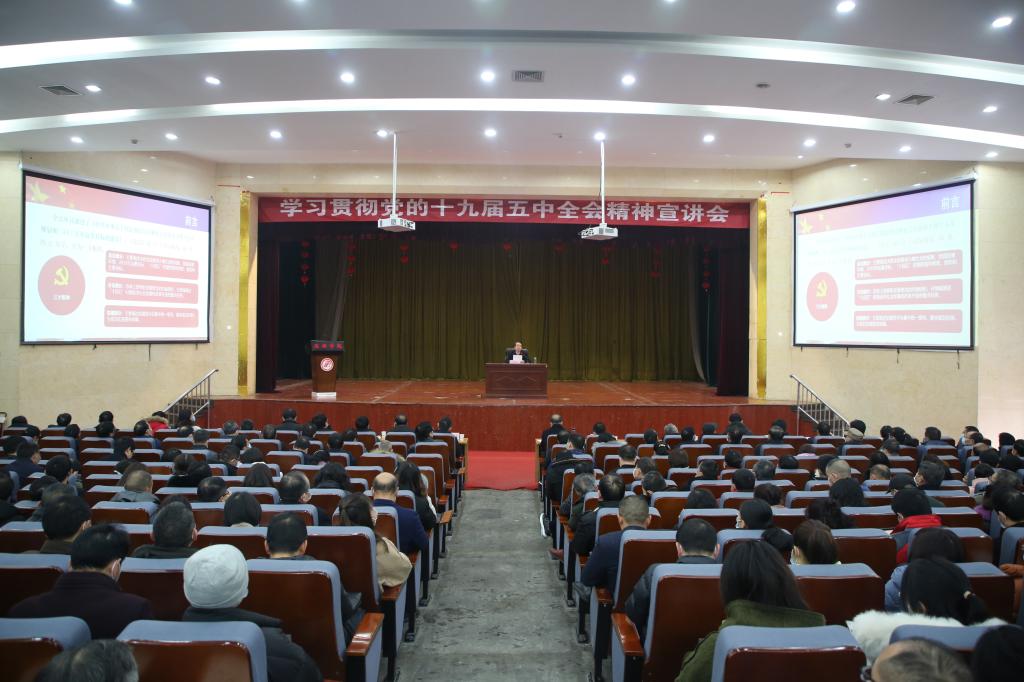12月10日,ac米兰学习贯彻十九届五中全会精神宣讲会在江南校区大礼堂举行。学校领导班子成员,全校无课教职员工、贯彻十九届五中全会精神大学生宣讲团成员部分学生代表等700余人参加了会议。ac米兰官方网站党委书记、十九届五中全会精神陕西高校党委宣讲团成员王国良做宣讲辅导报告,会议由党委副书记胡波主持。