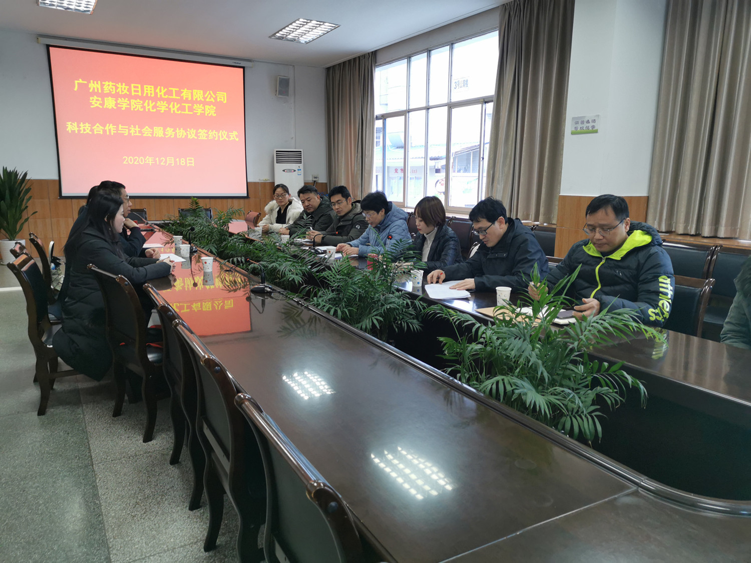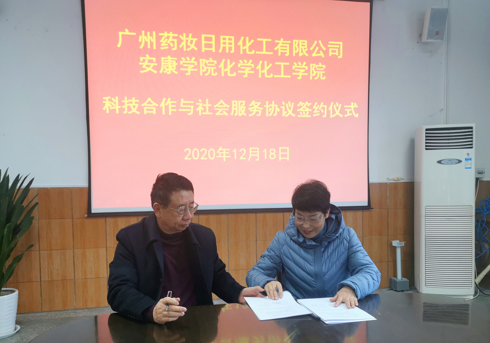 12月18日下午,化学化工学院与广州药妆日用化工有限公司在江南校区第一会议室举行了科技合作与社会服务签约仪式。广州药妆日用化工有限公司董事长张保罗,董事长助理党白银、林泽珊,化学化工学院院长柳林教授,副院长黄婷、袁光辉,化工系主任纪桢博士,制药工程系主任黄九林博士及教师代表参加了签约仪式。该仪式由黄婷副院长主持。