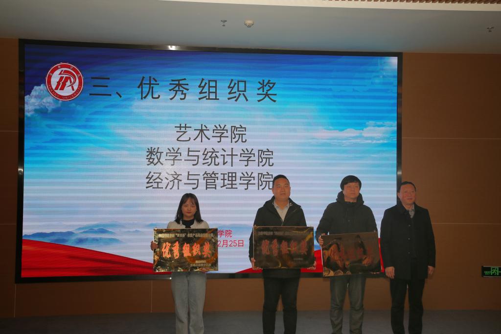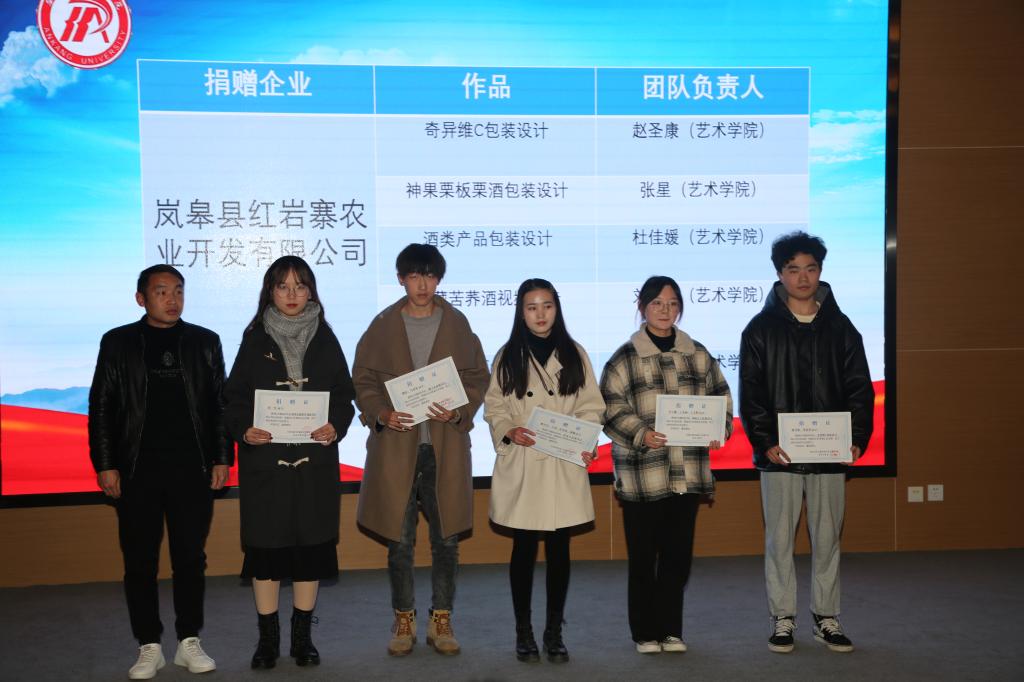 颁奖典礼上,体育学院张一凡《歌风春燕茶叶》、艺术学院金杉虹《吃货联盟-志根豆干包装设计》获得创新创意赛道包装设计类一等奖,艺术学院徐一峰《白河木瓜酒巴山-视频广告》获得创新创意赛道视频广告类一等奖,数统学院彭嘉伟《山中藏美酒,腊肉忆乡愁》获得创业实践赛道一等奖,艺术学院、数统学院、经管学院获得优秀组织奖。与会嘉宾向各获奖团队颁发证书。同时,ac米兰向帮扶企业捐赠了15件优秀设计作品,充分体现了ac米兰当代青年的责任与担当,展现了ac米兰服务“三农”、服务区域经济社会发展的办学方向。