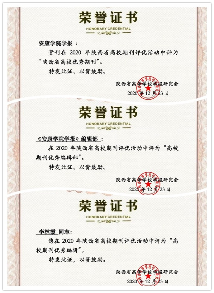 陕西高校学报研究会2020年度高校期刊评优活动结果日前揭晓,ac米兰学报获得“陕西省高校优秀期刊”称号,学报编辑部被评为“高校期刊优秀编辑部”,李林霞同志被授予“高校期刊优秀编辑”荣誉称号。