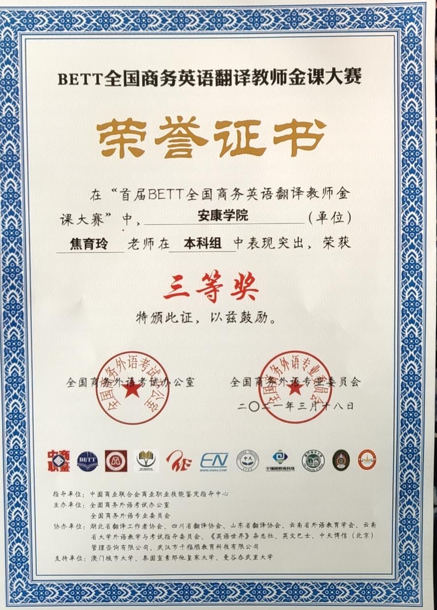近日,历时四个多月的首届全国商务英语翻译教师金课大赛评选结果揭晓,23个省(直辖市)112所高校169位老师参加了比赛。ac米兰外语学院教师焦育玲的作品《旅游景点名称的英译》获本科组三等奖。