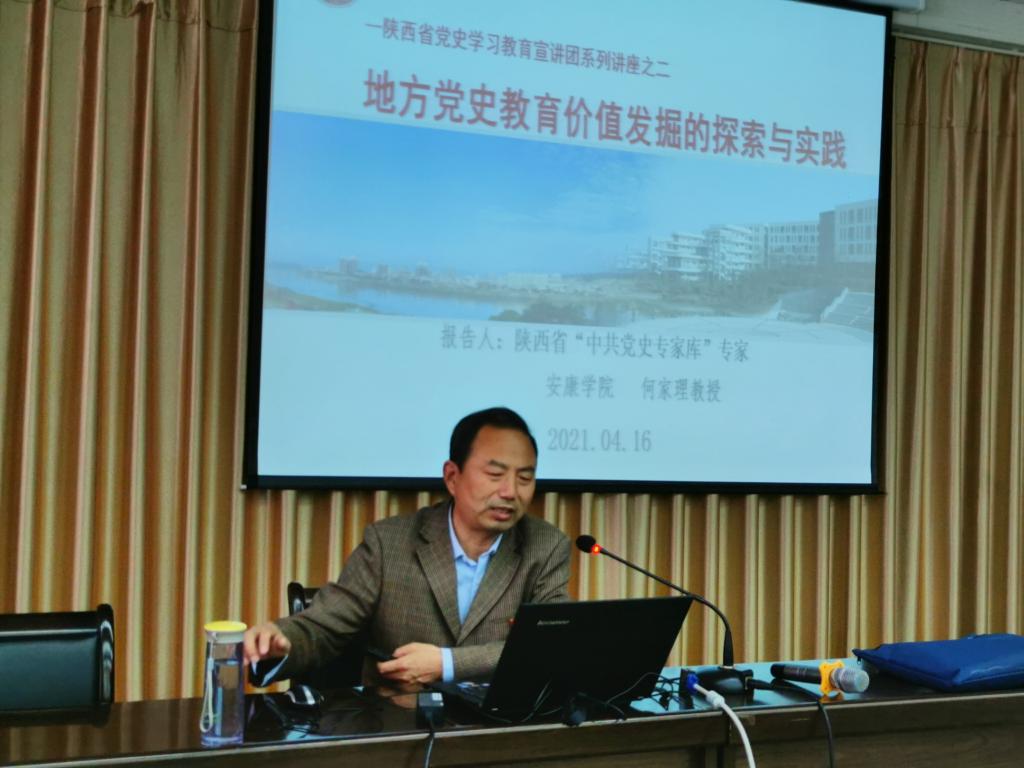 会上,陕西省“中共党史专家库”专家何家理教授以《地方党史教育价值发掘的探索与实践》为题,从党史学习教育总体要求、地方党史的涵义与特征、在梳理与研究中编纂地方党史、地方党史教育价值发掘探索四个方面深入系统地阐释了党史教育的重要意义,学习党史的必要性和具体方法,着重强调了党史学习教育要做到与学习习近平新时代中国特色社会主义思想和来陕重要讲话相结合、与当地党史教育相结合、与推动本职工作相结合。何家理还通过旬阳红军墓、平利革命先烈廖乾武、安康三线建设等大量的事实和数据,向参加活动的党员干部深入浅出地讲解了地方史的涵义与特征以及地方党史教育价值发掘探索,同时根据两个单位开展联建的实际需要,分享了科研团队打造及服务地方社会发展的有效经验。