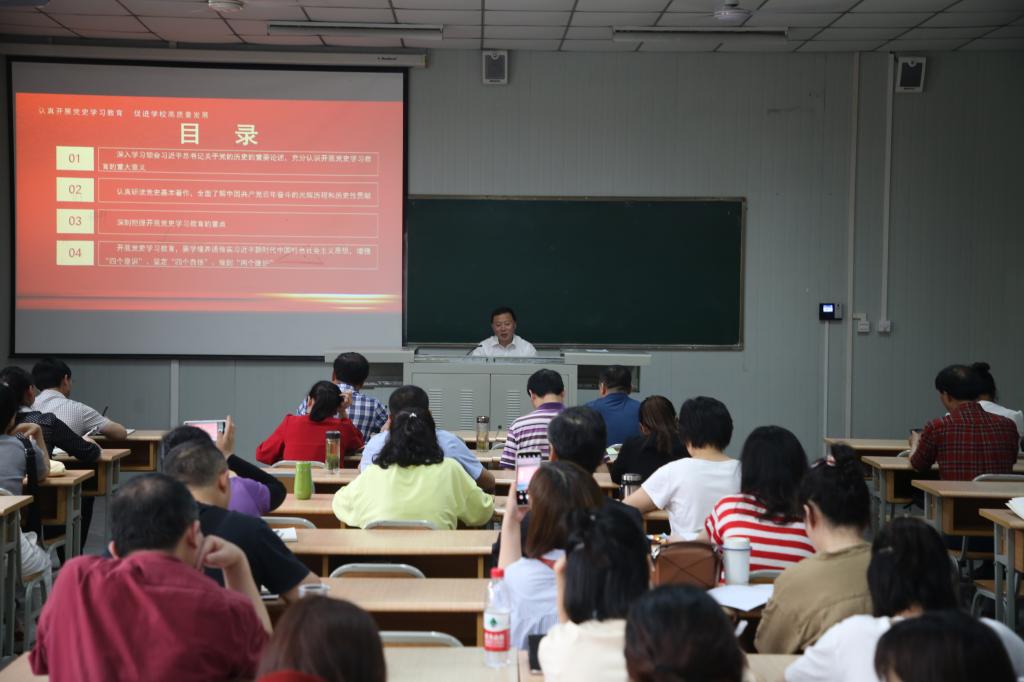 为认真学习贯彻习近平总书记在党史学习教育动员大会上的重要讲话精神,从党史中汲取智慧和前进力量,继承党的成功经验和优良传统,充分发挥党员干部、全院师生立足实际建新功,把思想和行动统一到习近平总书记重要讲话精神和学校发展建设上来,5月12日下午,学校党委副书记胡波在1014教室以“学党史守初心担使命促发展”为题作党史学习教育宣讲报告。外语学院、教育学院、团委、后勤保障处教职工参加了报告会。