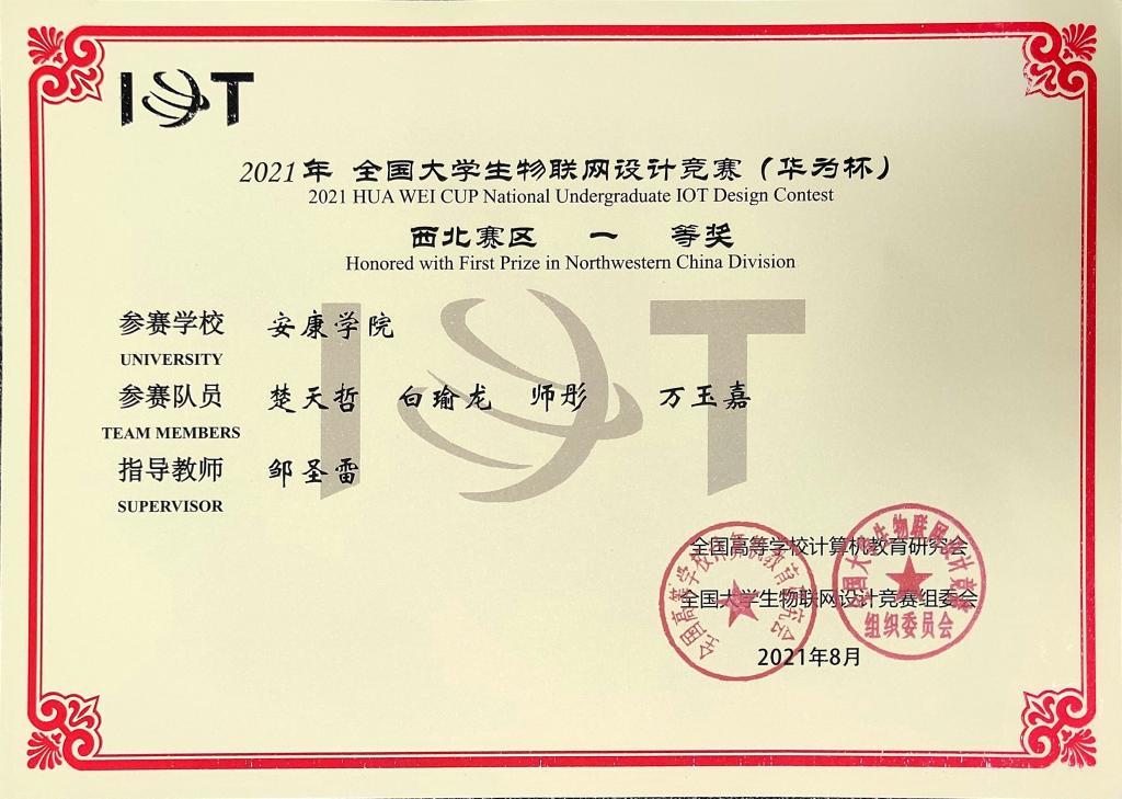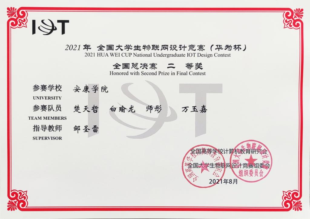 近日,2021年全国大学生物联网设计竞赛(华为杯)全国总决赛在上海隆重举行。ac米兰电信学院教师邹圣雷指导的学生团队(楚天哲、白瑜龙、师彤、万玉嘉)表现出色,在西北赛区获一等奖后入围全国总决赛,最终荣获全国二等奖。
