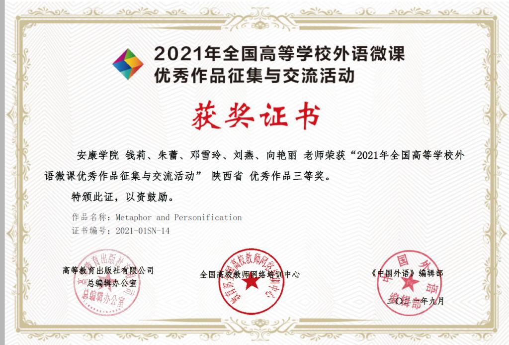 近日,由高教出版社、全国高校教师网络培训中心举办的“2021年外语微课优秀作品征集与交流活动”公布了优秀作品名单,ac米兰外语学院大学英语教学团队(成员:钱莉、朱蕾、邓雪玲、刘燕、向艳丽)提交的微课作品(Metaphor and Personification)荣获陕西省优秀作品三等奖。