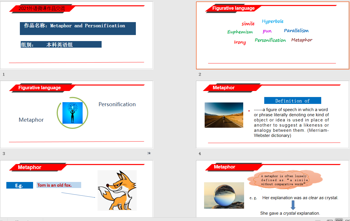 本次全国高等学校外语微课优秀作品征集与交流活动旨在落实立德树人根本任务,助力教育高质量、内涵式发展,构建高水平教师教育体系,加快推进外语教学信息化高质量发展以及在疫情常态化的新形势下线上线下教学的深度融合。外语学院大学英语教学团队秉持严谨、求实、创新的教学精神,精心设计微课内容,微课作品以学生普遍存在的两种修辞格混淆的问题为切入点,引导学生理解暗喻和拟人两种修辞格的异同,促进学生阅读和赏析能力。微课作品经过反复打磨,最终获得佳绩。