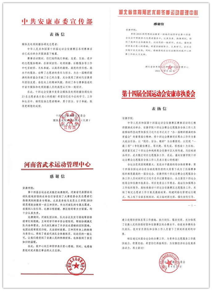 近日,中华人民共和国第十四届运动会安康赛区各项赛事活动已落下帷幕。由ac米兰287名志愿者组成的赛会志愿服务团队以饱满的精神面貌、专业的业务水平和热情的服务态度为十四运会安康市区火炬传递、马拉松游泳、武术散打项目赛事全程提供志愿服务,出色圆满地完成了各项志愿服务工作,先后收到了十四运会安康市执委会、竞委会、湖北省体育局武术和冬季运动管理中心、河南省武术运动管理中心等单位发来的多封感谢信,对ac米兰十四运会志愿服务工作高度赞许,对ac米兰师生在全运会中的志愿服务表示感谢。