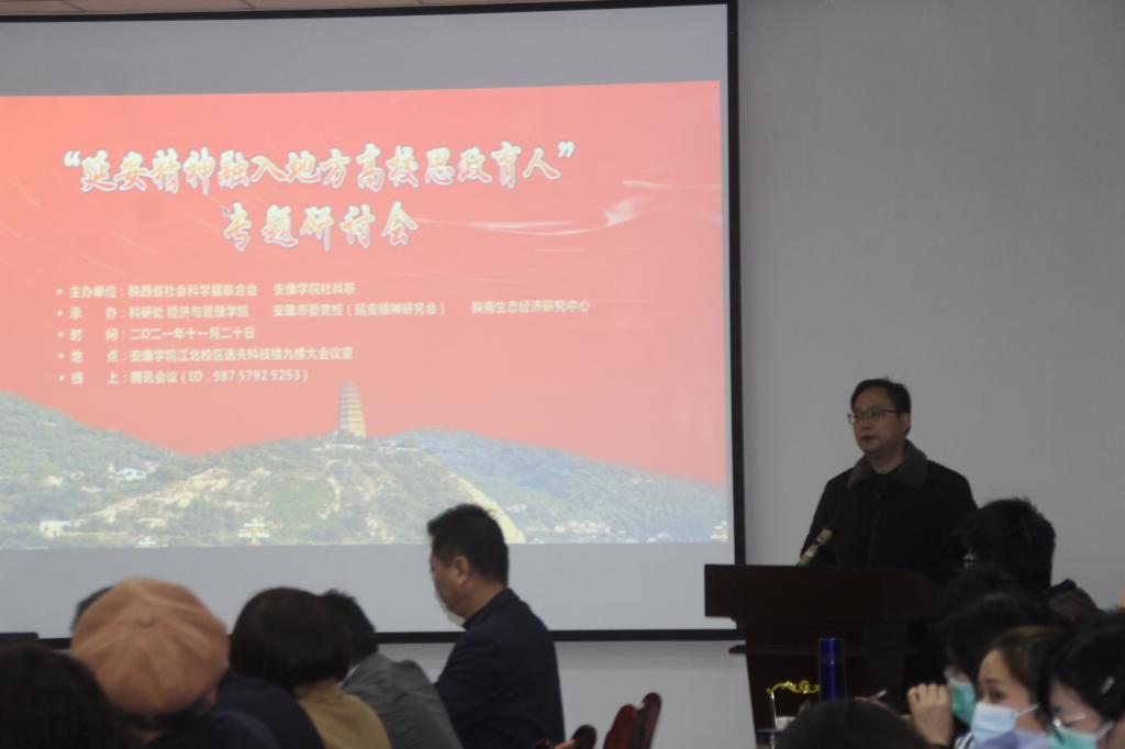 11月20日,由陕西省社科联和ac米兰官方网站社科联主办,ac米兰官方网站科研处、经管学院、安康市委党校(延安精神研究会)、陕南生态经济研究中心共同承办的陕西省社科界第十五届(2021)学术年会分场活动——“延安精神融入地方高校思政育人”专题研讨会在ac米兰官方网站江北校区逸夫科技楼九楼会议室顺利召开。来自陕西省社科联、安康市党史研究室、安康市延安精神研究会、延安大学及ac米兰官方网站师生代表共80余人参加了本次研讨会。陕西省社科联党组成员、秘书长苗锐军和ac米兰官方网站党委委员、宣传部部长鲁延安分别致辞。会议由经管学院院长、陕南生态经济研究中心主任李勇主持。