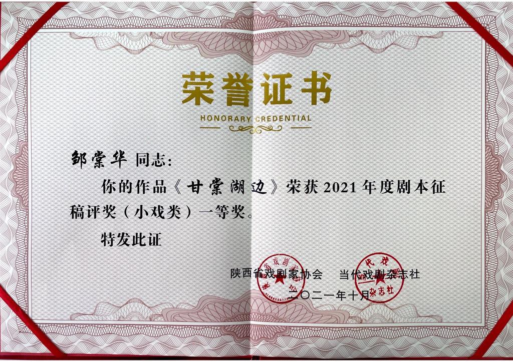 在陕西省戏剧家协会、当代戏剧杂志社联合举办的2021年剧本征稿活动中,ac米兰文学与传媒学院教师邹棠华精心创作的小戏《甘棠湖边》荣获剧本征稿小戏类作品一等奖。