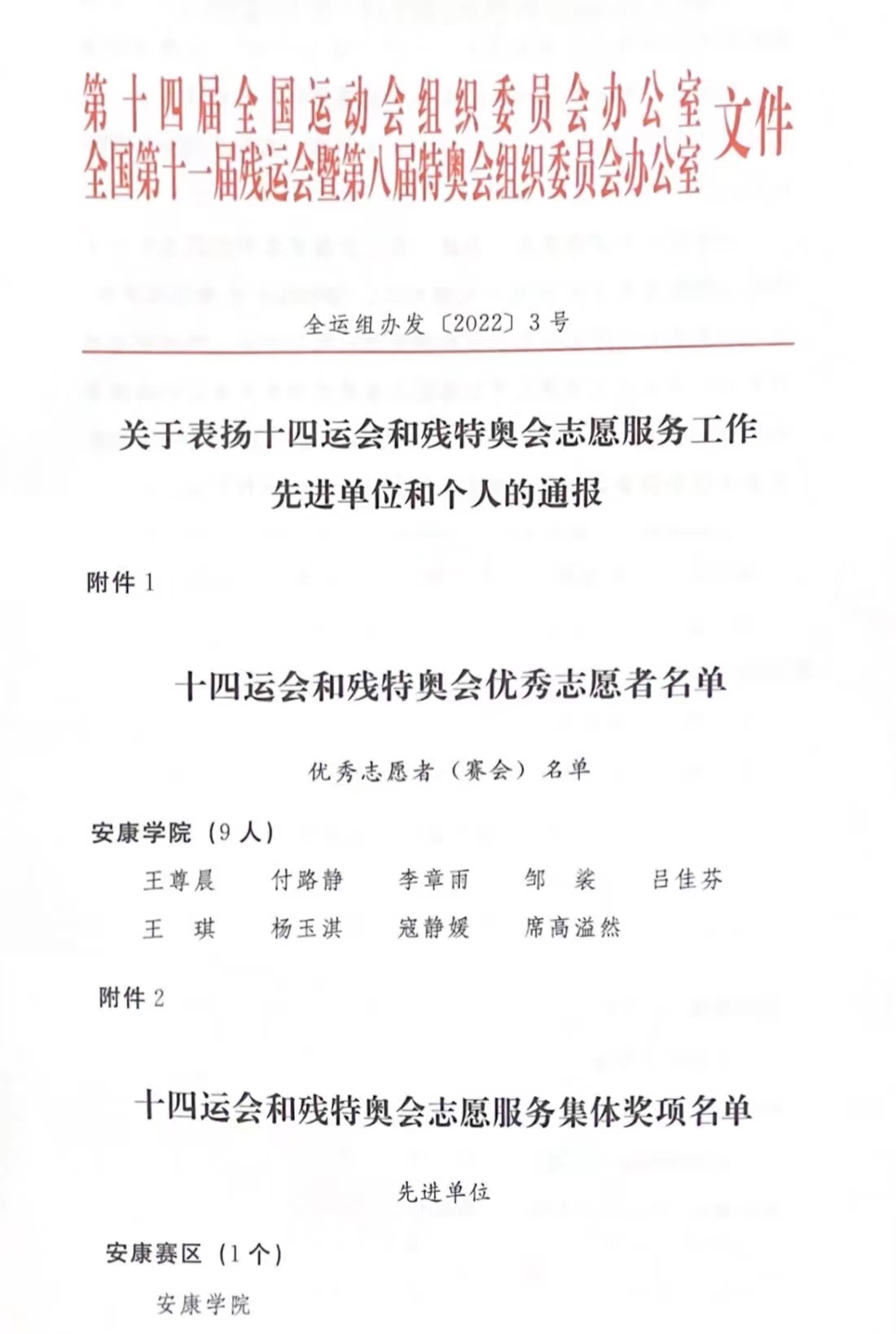 近日,第十四届全国运动会组织委员会办公室、全国第十一届残运会暨第八届特奥会组织委员会办公室联合发布了《关于表扬十四运会和残特奥会志愿服务工作先进单位和个人的通报》,ac米兰官方网站获十四运会和残特奥会志愿服务先进单位荣誉称号,付路静等9名师生获十四运会和残特奥会优秀志愿者荣誉称号。