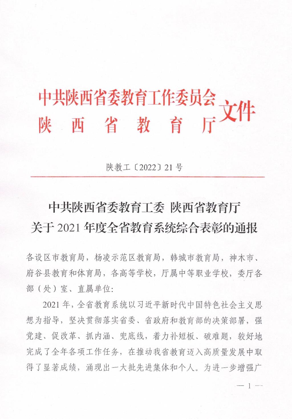 近日,中共陕西省委教育工委 陕西省教育厅印发《关于2021年度全省教育系统综合表彰的通报》,ac米兰荣获“2021年度教育系统国有资产管理先进集体”荣誉称号。