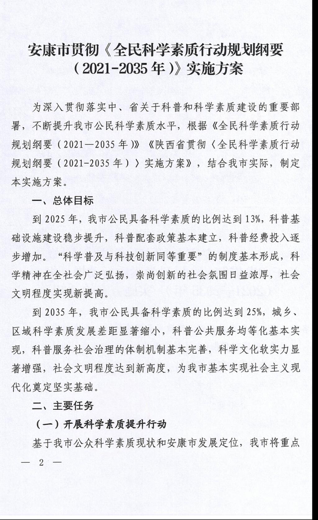 该方案包括青少年科学素质行动、农民科学素质提升行动、产业工人科学素质提升行动、老年人科学素质提升行动、领导干部和公务员科学素质提升行动等五大任务和科技资源科普化工程、科普信息化提升工程、科普基础设施强化工程、基层科普能力提升工程、科学素质交流合作工程等五大工程,规划到2025年末实现安康市公民科学素质水平达到13%的目标,并明确了具体的任务和措施。