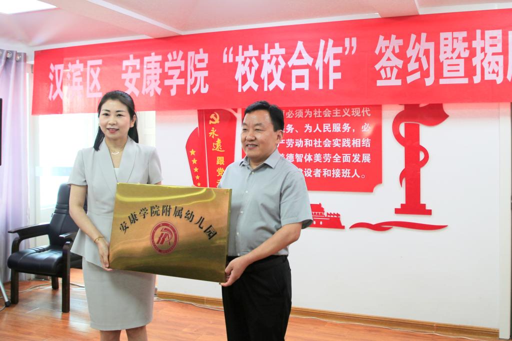 余谦代表学校与汉滨初中、汉滨小学、汉滨区区幼儿园负责人签订合作协议。