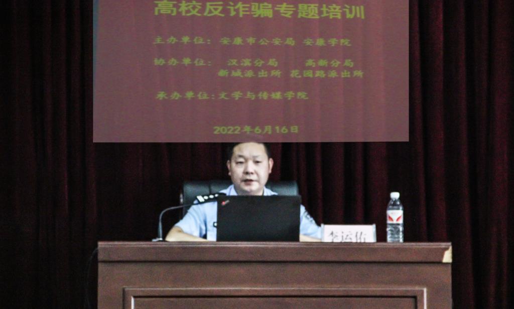 6月16日下午,ac米兰官方网站联合安康市公安局在江南校区大礼堂开展高校反电信诈骗专题教育培训活动。本次活动采用线上线下相结合形式进行,由ac米兰保卫处主办,文传学院承办。全国刑事信息研判专家、安康市反诈中心主任李运佑、警员康洋,ac米兰所属辖区安康市汉滨区新城派出所、高新区花园路派出所民警,ac米兰官方网站保卫处全体成员、学工部、各二级学院师生代表加了此次活动。