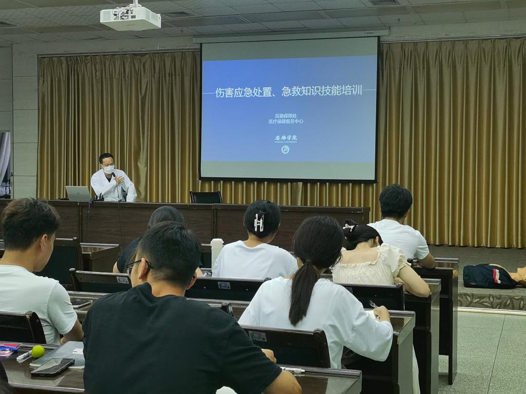 医疗保健服务中心医师梁汝江介绍了中暑、溺水、烧烫伤、成人徒手心肺复苏、海姆立克急救法、止血、包扎、骨折固定等各种常见的紧急情况急救措施和注意事项,并通过视频和现场演示,展示了各类包扎法的具体操作步骤以及挫伤、扭伤、擦伤和烧烫伤等方面的急救措施,向现场师生演示了自救方法和技巧;对参加培训的师生进行了现场心肺复苏完整流程的实操培训,并对按压动作、力度、频率、注意事项等细节逐一讲解和示范。