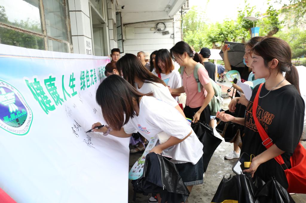 活动现场通过悬挂横幅、设置咨询台、展示毒品仿真模型、摆放禁毒展板、发放禁毒宣传资料、推广禁毒微信公众号进行禁毒反毒签名等方式,向广大师生宣讲毒品的种类、危害以及如何远离毒品、防范毒品等知识。