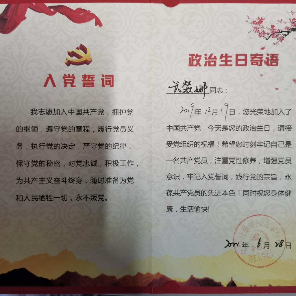 共过一次政治生日·分享一个入党故事。艺术学院学生党支部为全体毕业生党员精心设计了党员政治生日纪念卡。毕业生党员代表曹丁太、惠洁婷分享了入党故事。通过共过政治生日、分享入党故事,使每名学生党员强化身份意识,坚定政治信仰,永葆政治本色。