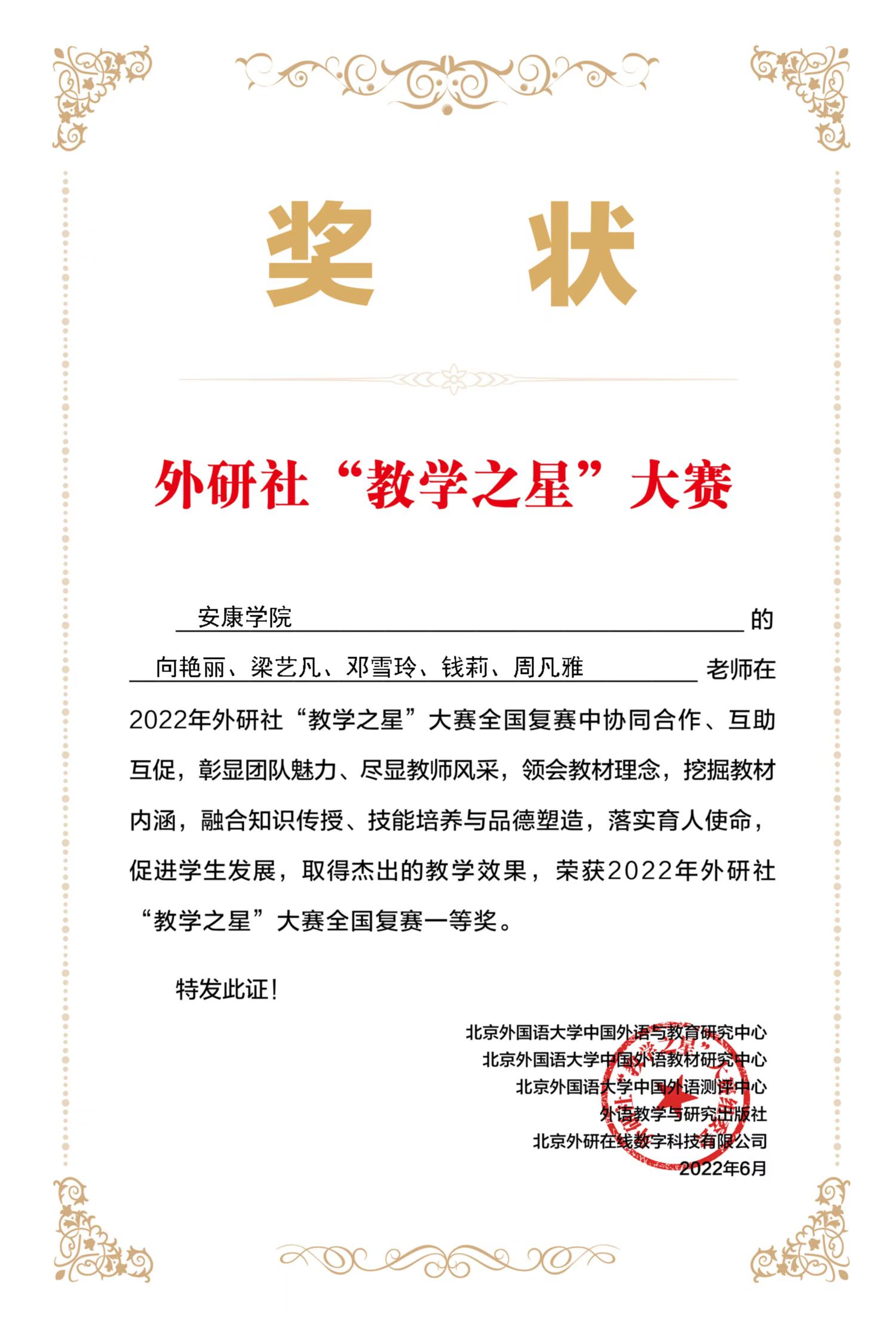 近日,2022年外研社“教学之星”大赛全国复赛结果揭晓。ac米兰外语学院推荐的两个教学团队在全国各高校共计569份参赛作品中脱颖而出:由副院长胡卫卫作为团队负责人的专业教师教学团队(成员:周玫、王欢、姜国波、彭方圆)和向艳丽副教授带领的大学英语教学团队(成员:梁艺凡、邓雪玲、钱莉、周凡雅)分别荣获英语专业组全国复赛一等奖和大学英语组全国复赛一等奖的好成绩。