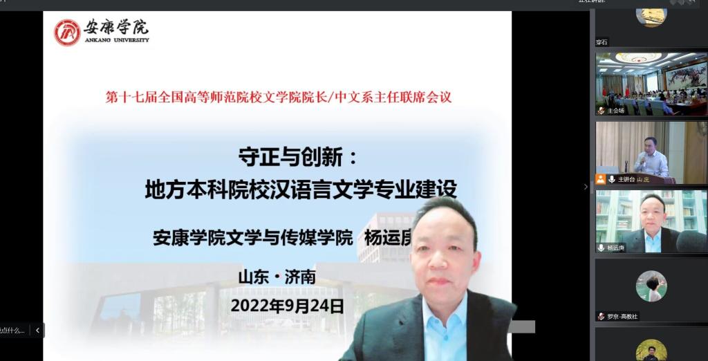 9月24-25日,第十七届全国高等师范院校文学院院长/中文系主任联席会议在山东师范大学召开,会议通过线上线下结合的方式举行,全国80余所师范院校的150余名文学院院长、中文系主任参加了会议。ac米兰文学与传媒学院院长杨运庚教授以线上的方式参加了会议并做了大会报告。