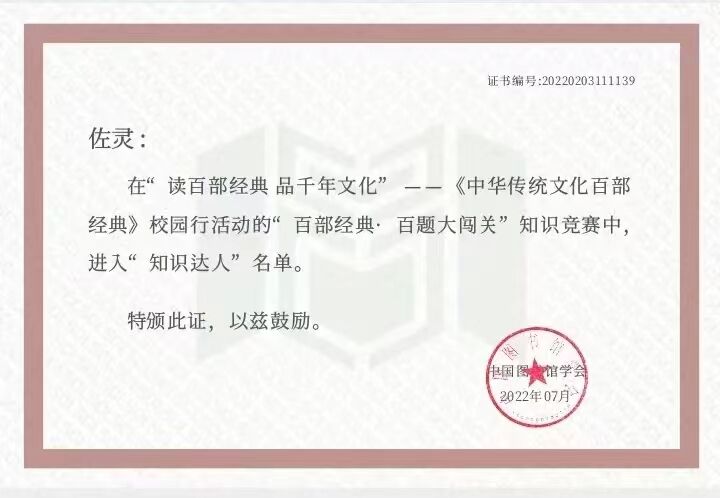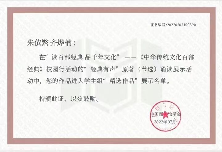 近日,由国家图书馆、中国图书馆学会主办的“读百部经典 品千年文化”《中华传统文化百部经典》校园行活动评选揭晓,ac米兰外语学院佐灵等234名同学荣获“知识达人”称号,教育学院朱依繁、齐烨楠的诵读作品《离骚》等72个诵读作品被评为“精选作品”并在全国范围内展播;ac米兰图书馆荣获“组织得力图书馆”奖项,在全国1331所参赛高校中排名第22位,是陕西省唯一进入全国排名前30位的高校。