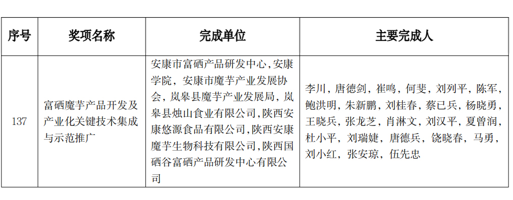 近日,2019-2021年度全国农牧渔业丰收奖获奖名单公布,由ac米兰魔芋科技创新团队李川教授主持,办学顾问崔鸣研究员及何斐博士、朱新鹏教授等团队成员共同完成的“富硒魔芋产品开发及产业化关键技术集成与示范推广”项目荣获2019-2021年度全国农牧渔业丰收奖三等奖。