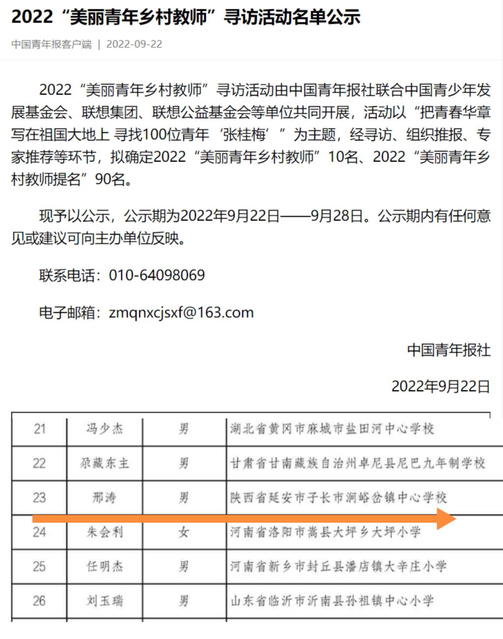 同时,由中国青年报社联合中国青少年发展基金会、联想集团、联想公益基金会等单位共同开展的2022年“美丽青年乡村教师”寻访活动名单公布,确定2022年“美丽青年乡村教师”10名、2022年“美丽青年乡村教师提名”90名,陕西省入选7人,邢涛同学成功入选2022年“美丽青年乡村教师提名”。