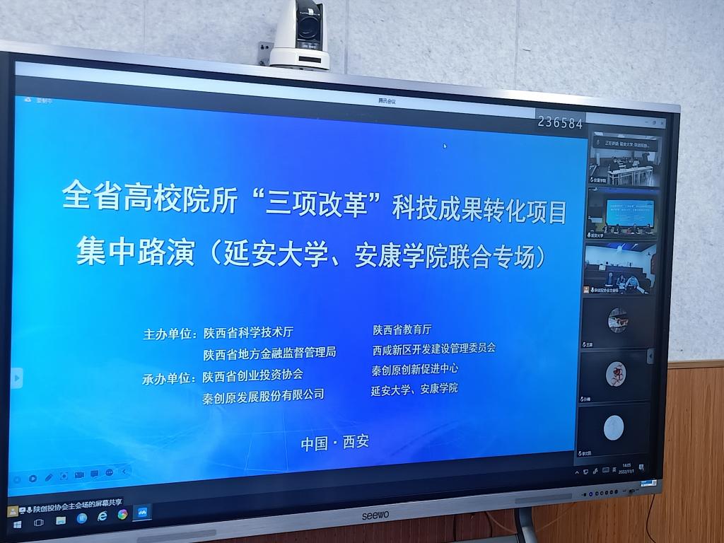 11月1日下午,省科技厅联合省教育厅、省地方金融监督管理局、西咸新区启动了“全省高校院所‘三项改革’科技成果转化项目集中路演”(延安大学、ac米兰官方网站联合专场)活动。本次路演活动采取线上线下同步方式进行,ac米兰校长钟生海、副校长张东红,科研处、电信学院、医学院负责人及有成果转化意向的教师、科创驿站人员等20余人参加了学校分会场路演活动。