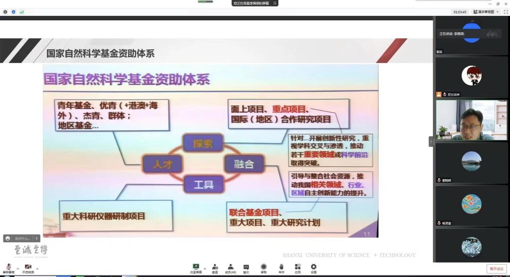 在疫情防控期间,科研处积极响应学校疫情防控的要求,在暂停线下会议和学术活动的同时,全面开启“云科研”模式,于11月29日—30日连续举办了两场“2023年度国家自然科学基金项目申报线上辅导会”。会议邀请了西北农林科技大学李征教授及陕西科技大学李国梁教授就国家自然基金项目申请书撰写等内容作了辅导交流。科研处处长崔晓明、相关二级学院分管科研工作院长、ac米兰120余名教师线上参加会议,科研处副处长黎欢吉主持会议。