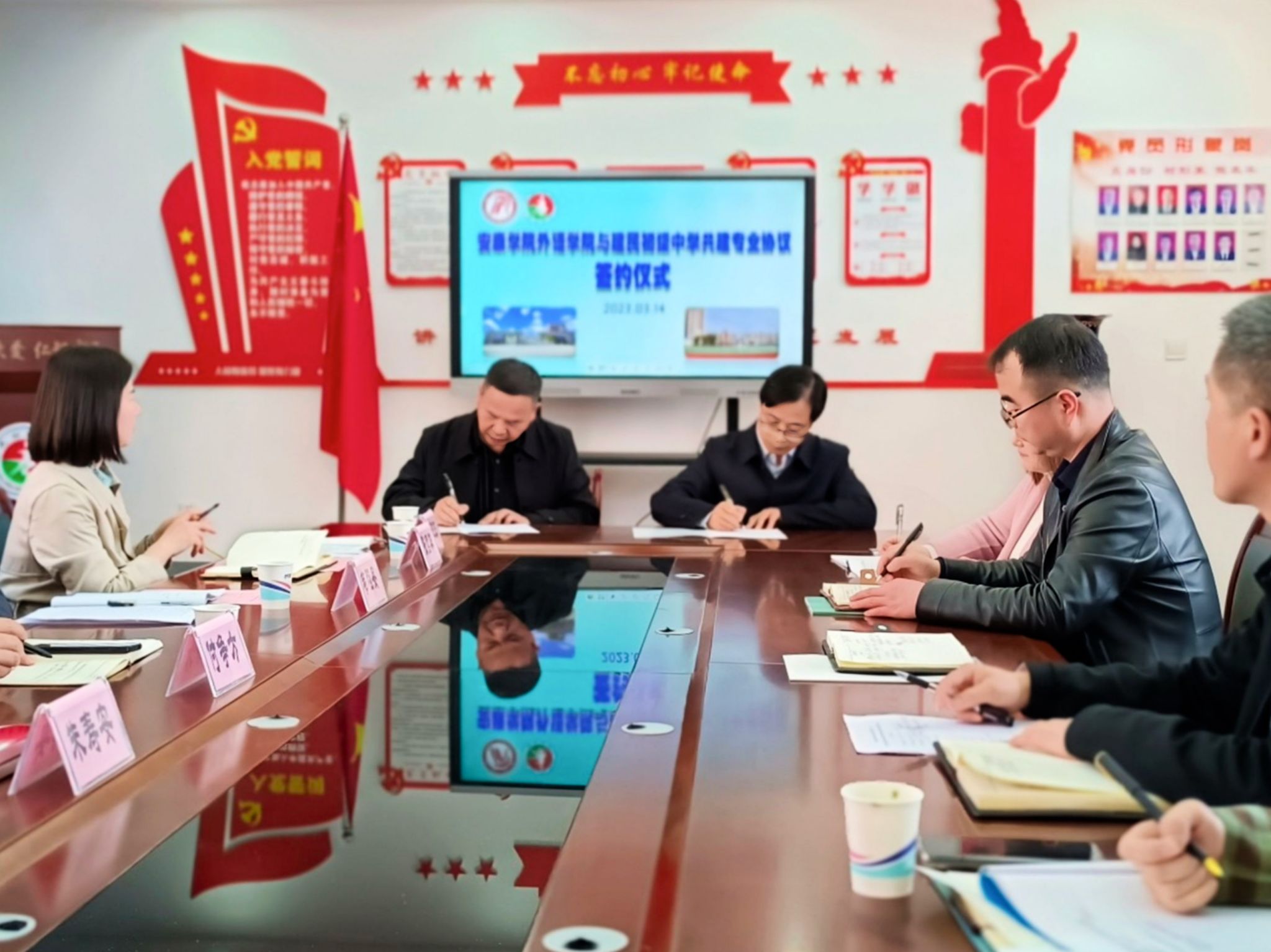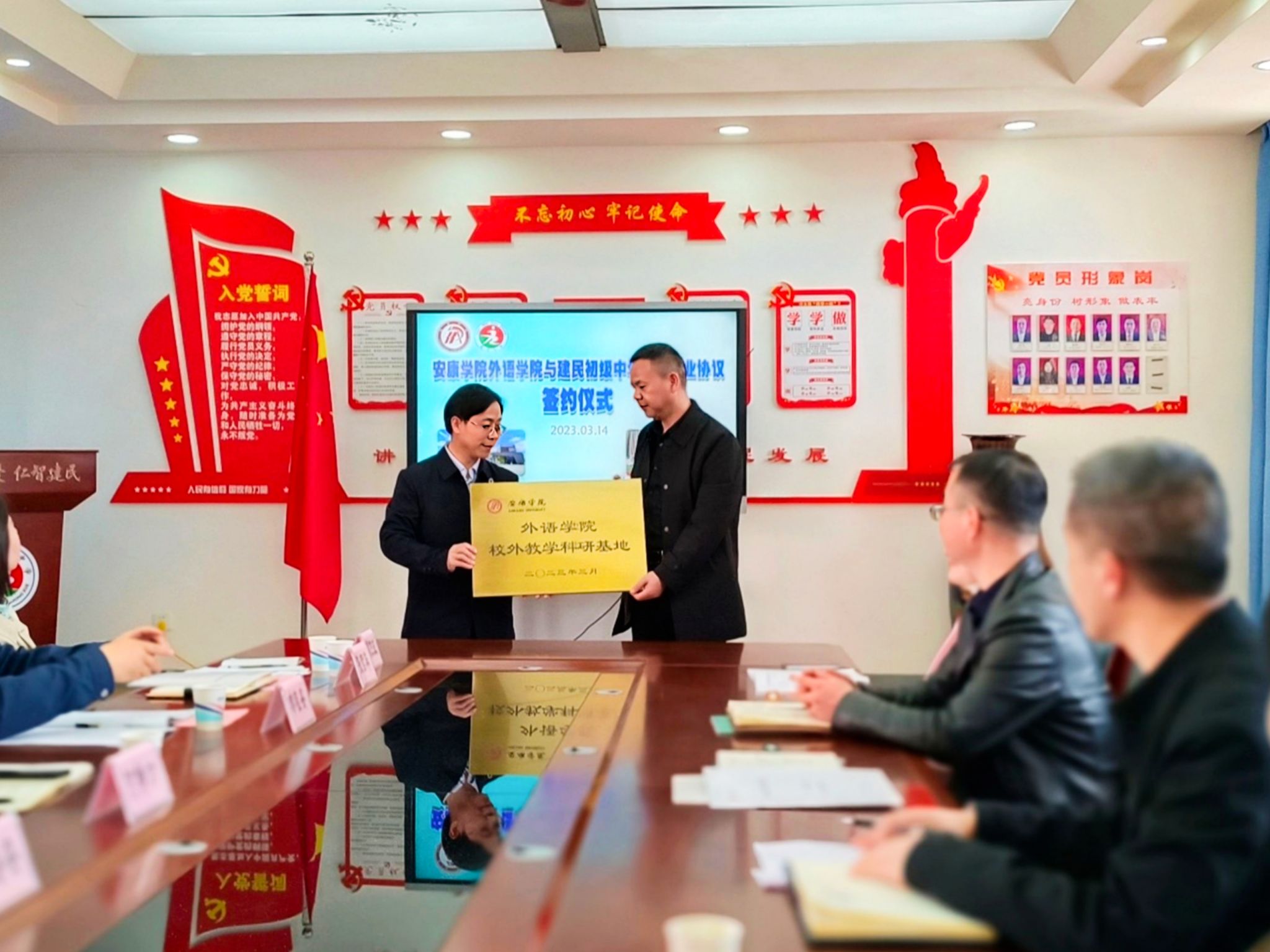 张哲华、周章群代表双方签订了专业共建协议,并为建民初中颁发“ac米兰官方网站外语学院校外教学科研基地”牌匾。