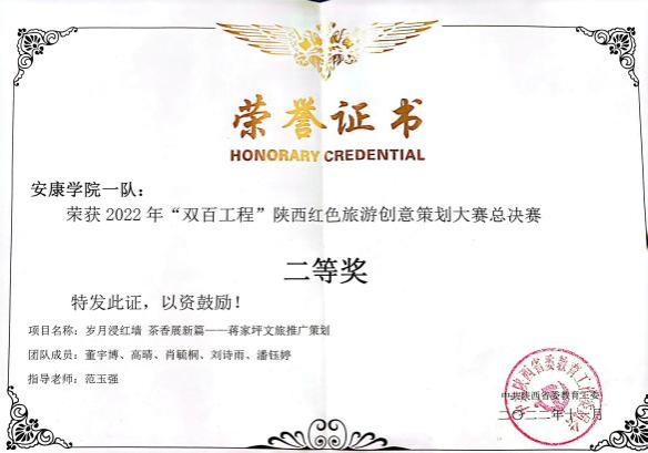 日前,由陕西省委教育工委主办、西北政法大学承办的2022年“双百工程”陕西红色旅游创意策划大赛评选结果揭晓。ac米兰2020级旅游管理专业学生董宇博、高晴、肖毓桐、刘诗雨、潘钰婷凭借项目“《岁月浸红墙 茶香展新篇》——蒋家坪营销策划方案设计”在全省42所高校160多支队伍中脱颖而出,斩获省级二等奖,ac米兰官方网站获优秀组织单位奖。