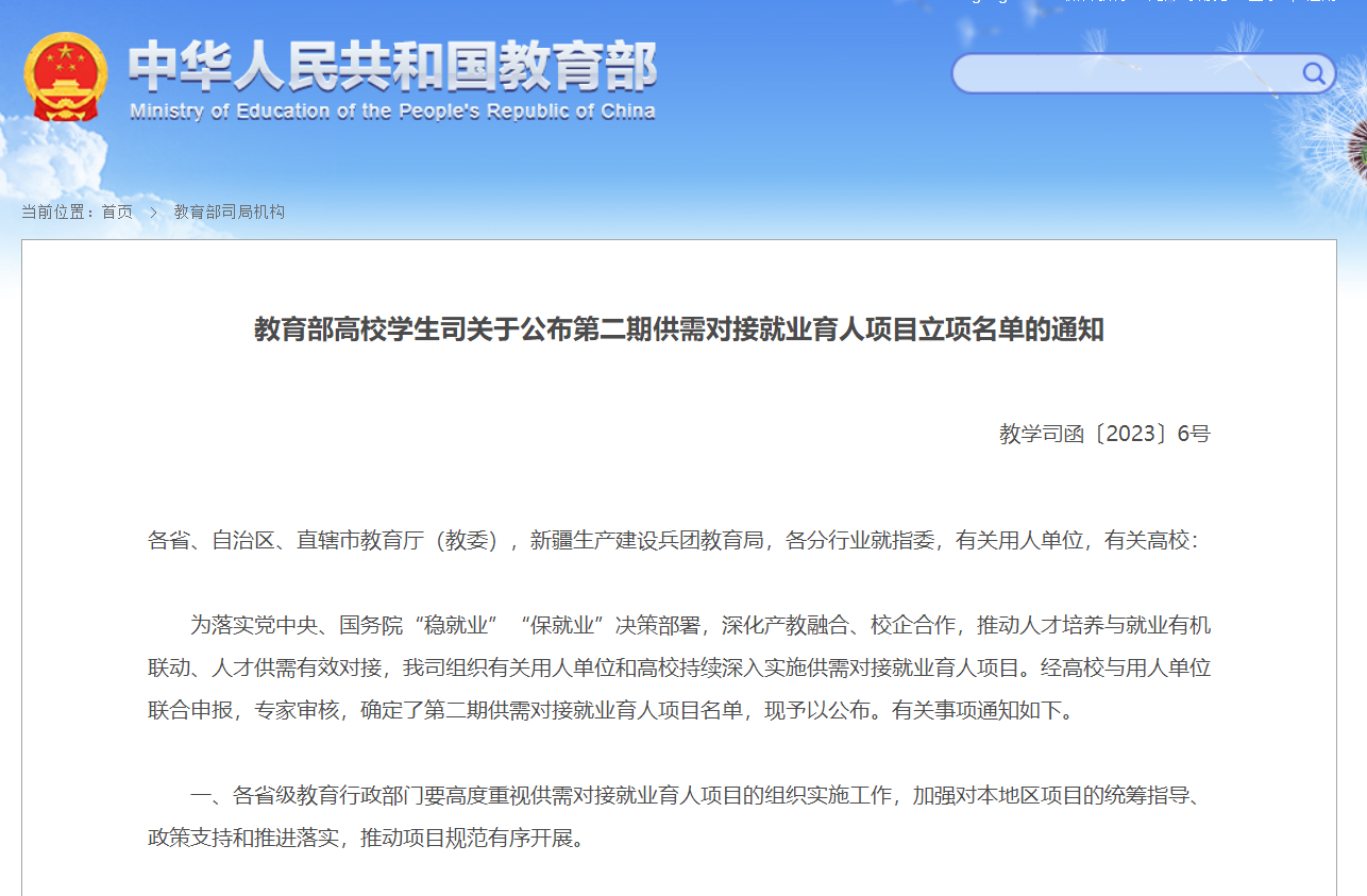教育部供需对接育人项目是教育部为落实党中央、国务院“稳就业”“保就业”决策部署,是深化产教融合、校企合作,推动人才培养与就业有机联动、人才供需有效对接,由教育部高校学生司组织发起,有关用人单位和高校共同实施的深化产教融合校企合作项目。