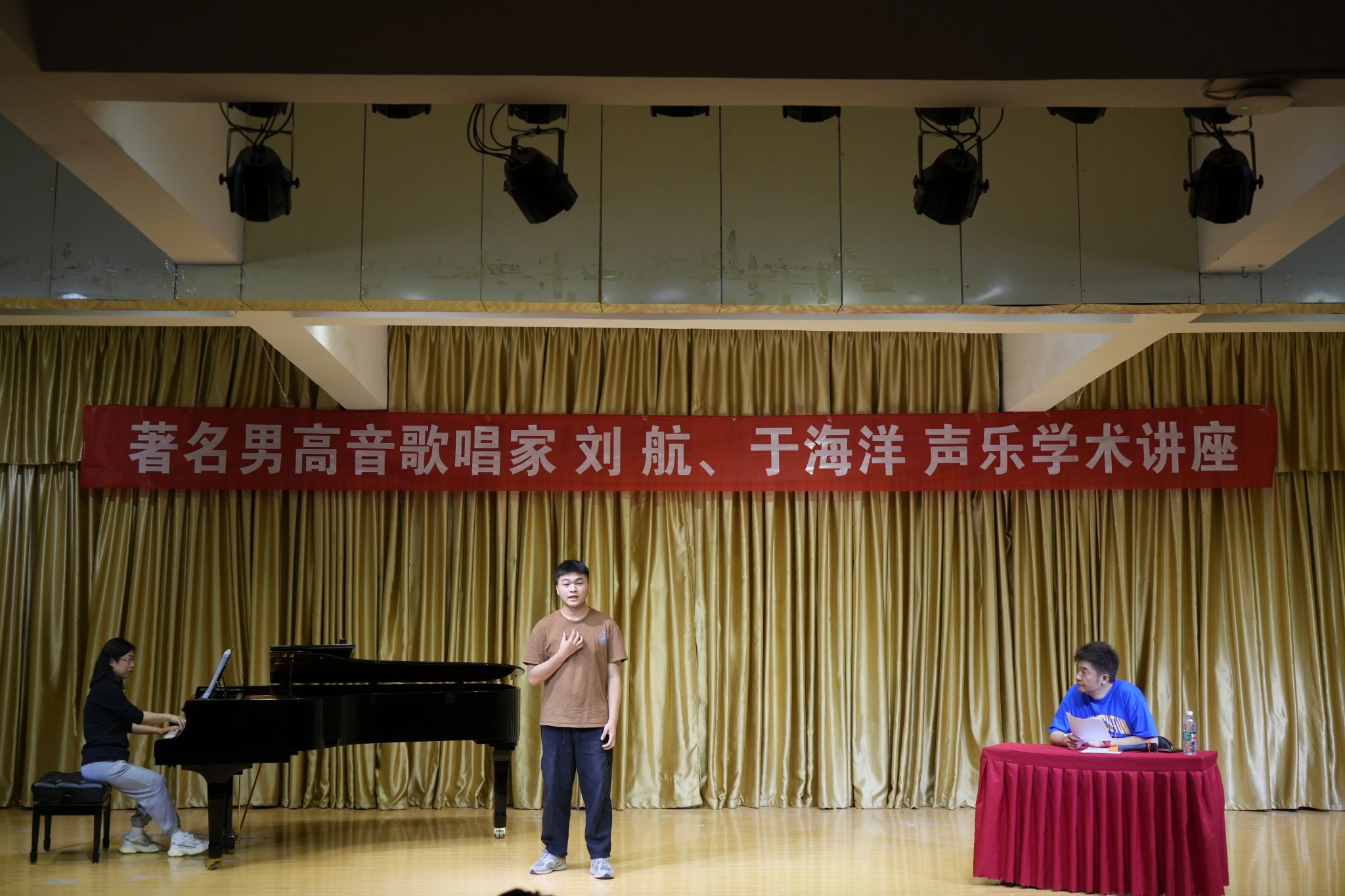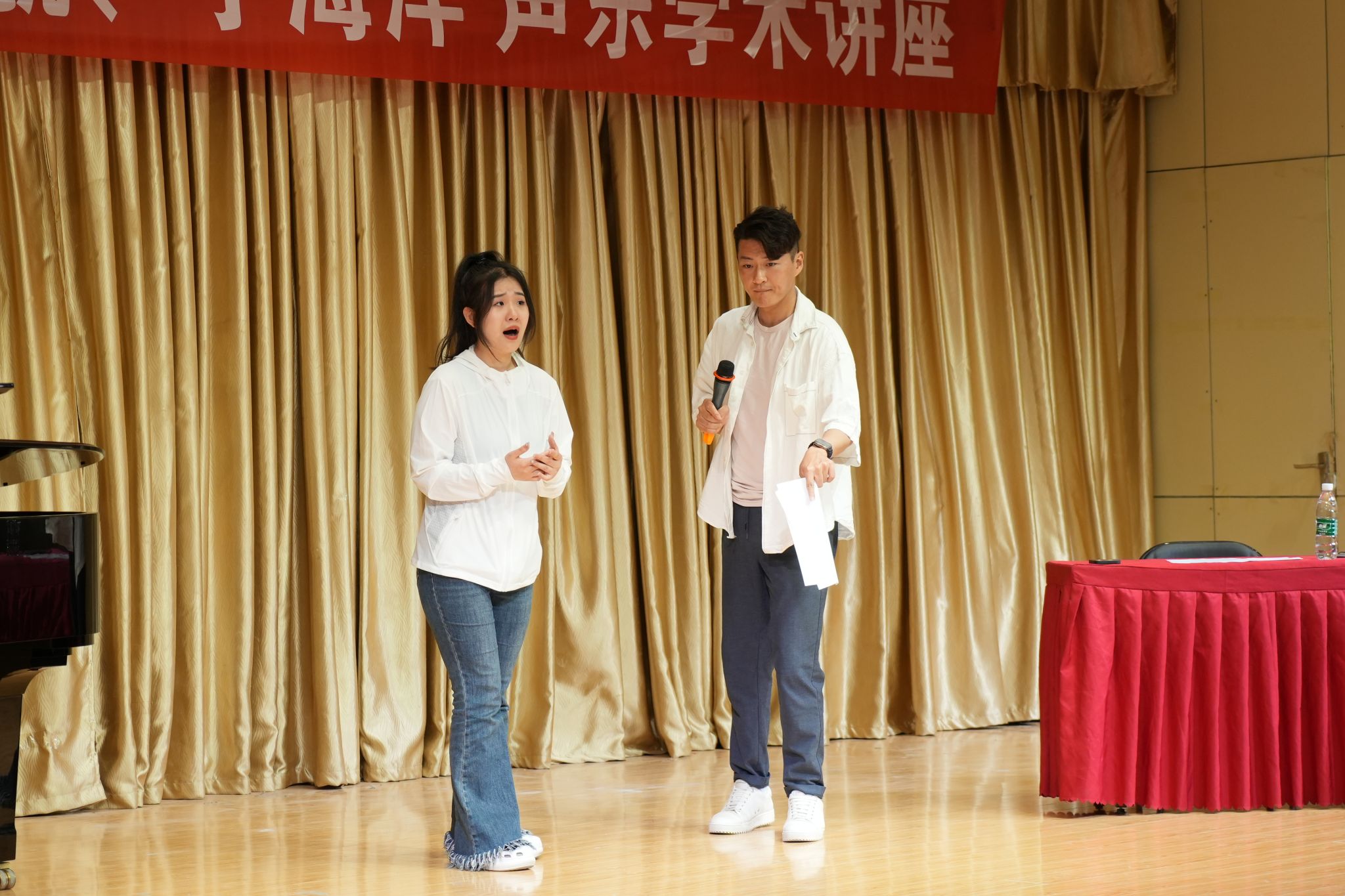 刘航从发声方法、共鸣腔体、具体技术运用和声乐专业词汇解析等多个角度讲授声乐演唱的科学方法,并为艺术学院师生进行现场指导;于海洋结合《念奴娇.赤壁怀古》《思儿》等中国艺术歌曲、歌剧选段现场指导学生进行演唱。两位主讲嘉宾语言诙谐幽默、精彩生动,现场气氛热烈。