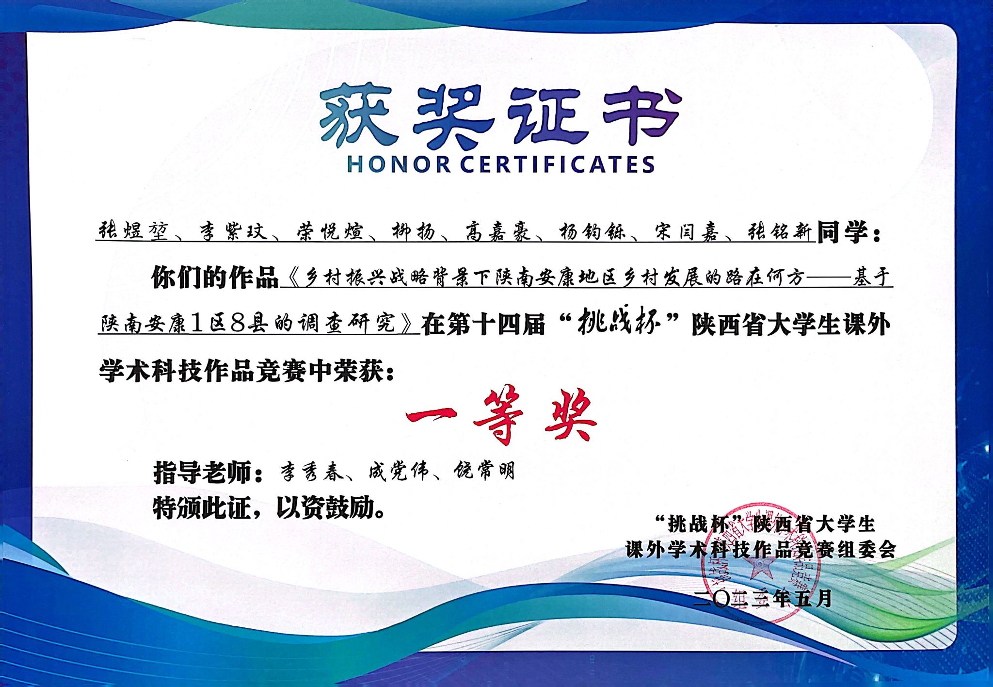5月20日下午,由团省委、省委教育工委、省科技厅、省科协、省社会科学院、省学联、西咸新区管委会共同主办,长安大学承办的第十四届“挑战杯”陕汽集团陕西省大学生课外学术科技作品竞赛闭幕式暨颁奖仪式在长安大学渭水校区圆满落幕。ac米兰参赛作品《乡村振兴战略背景下陕南安康地区乡村发展的路在何方——基于陕南安康1区8县的调查研究》荣获一等奖、《基层党建推进脱贫攻坚成果与乡村振兴有效衔接调查——以秦鲁两省五村为例》、《新内生视角下脱贫到乡村振兴陕南茶农价值转变调查报告——以平利县蒋家坪村为例》2件作品荣获二等奖。