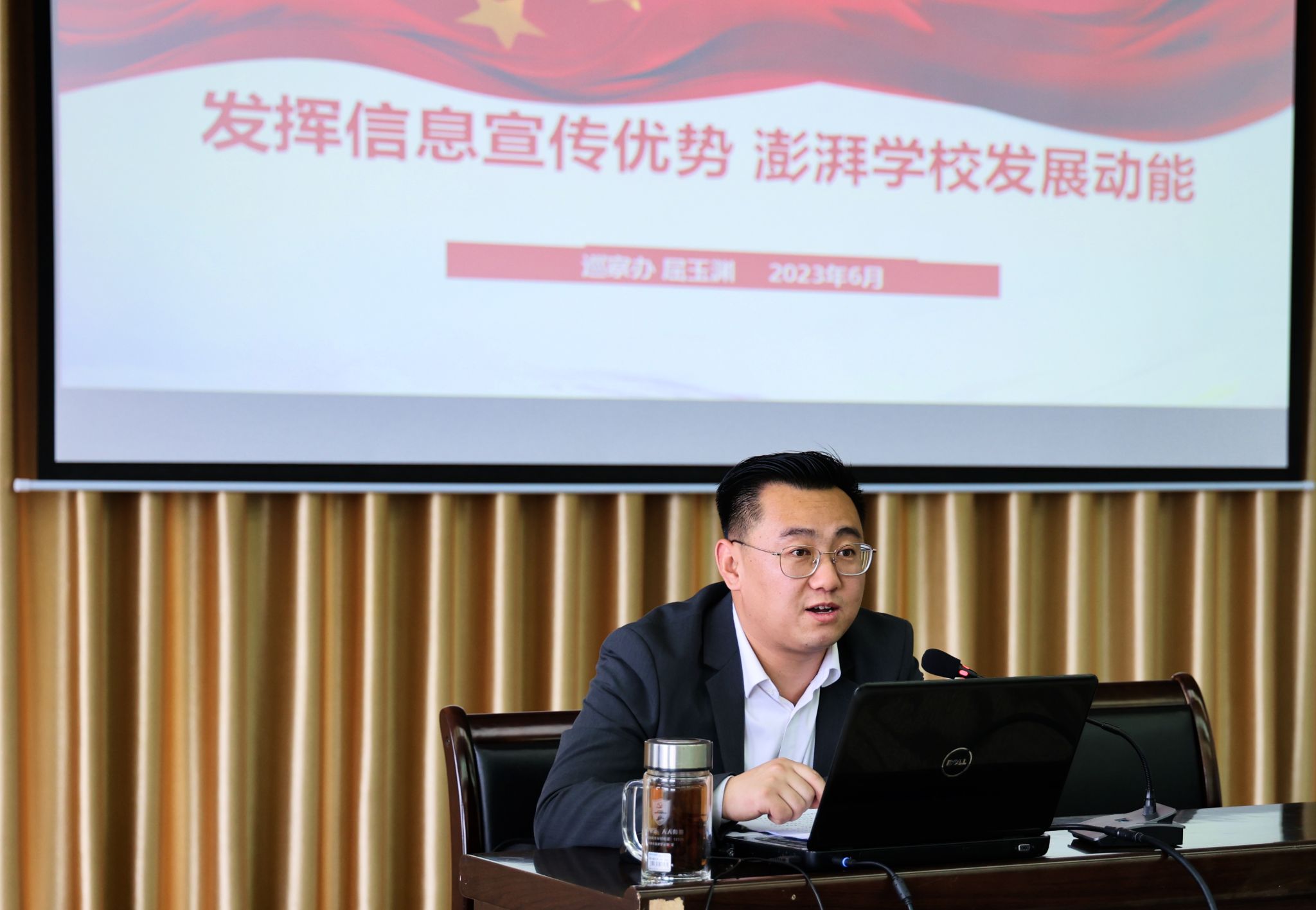 本次培训班先后安排新闻宣传与舆情引导处置两个专题,其中党委委员、宣传部部长鲁延安以《构筑网上网下同心圆,踔厉奋发树新人》为题,围绕互联网这个“最大变量”,结合近年来教育领域出现的舆情案例,深刻剖析了全媒体时代高校网络舆情传播与发展的特点和规律,分享了当前网络环境下舆情事件研判、引导与处置方面的思考;巡察办综合科副科长屈玉渊以《发挥信息宣传优势,澎湃学校发展动能》为题,从信息宣传工作的极端重要性、做好信息宣传工作的要领、新闻宣传工作的特点三方面分享了高校信息宣传工作的技巧、方法和思路。