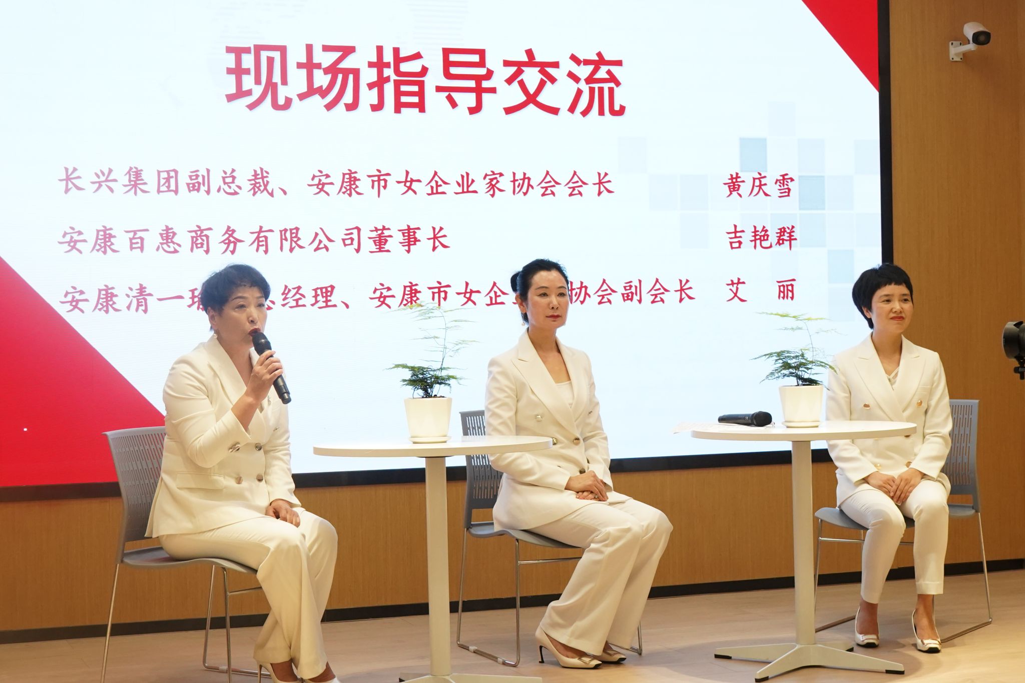 安康市妇联兼职副主席、市女企业家协会会长、巾帼创业导师黄庆雪做首场创业指导报告,并与安康百惠商务有限公司董事长吉艳群、市女企业家协会副会长艾莉共同为毕业生现场推介招聘岗位。在会场中,三位女企业家现场指导,答疑解惑,回答毕业生们关心的企业家成功之路、实体经济重要意义、如何看待网络经济、网店、理财等提问,进行“一对一”交流,气氛活跃,掌声不断。