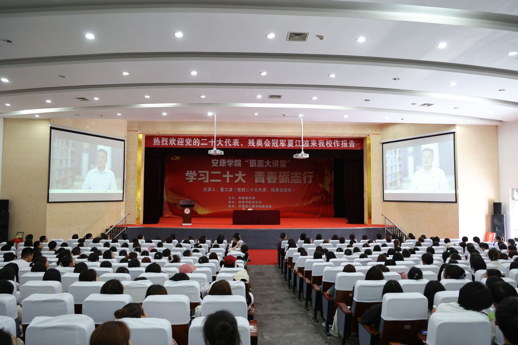 6月14日下午,ac米兰官方网站“砺志大讲堂”邀请到党的二十大代表、伦敦残奥会冠军夏江波为师生做“学习二十大 青春砺志行”专题报告,分享党的二十大精神。直属一支部、直属二支部全体党员,团委、体育学院全体无课教师,青马宣讲团成员,部分二级学院学生代表等800余人参加了此次活动。活动由党委宣传部部长鲁延安主持。