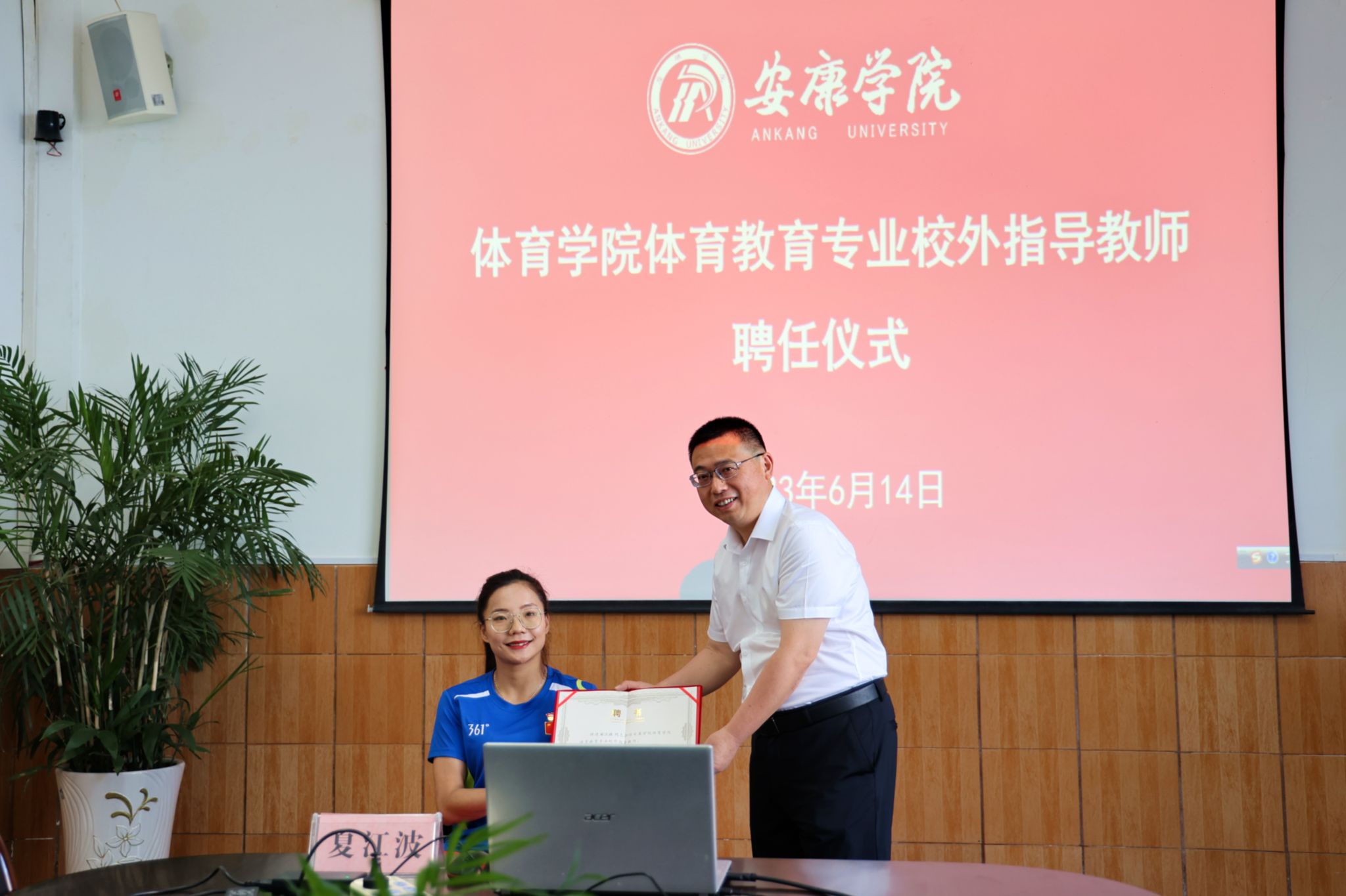 会前,校长钟生海热情接待了夏江波,ac米兰体育学院聘请夏江波为校外指导教师,副校长余谦为其颁发聘书。