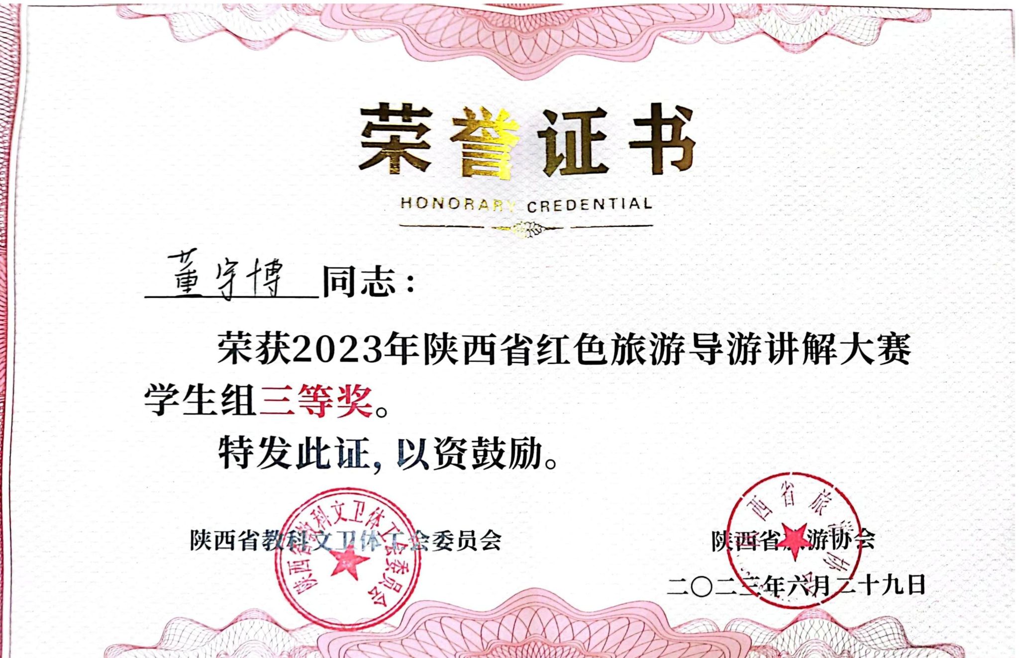 6月30日,由陕西省教科文卫体工会委员会和陕西省旅游协会主办的2023年“陕西红色旅游讲解大赛”在陕西省职业技术学院白鹿原校区举行。ac米兰旅环学院旅游管理2020级1班董宇博、刘诗雨两名学生分获三等奖、优秀奖各1项,旅游与资源环境学院获优秀组织单位奖。