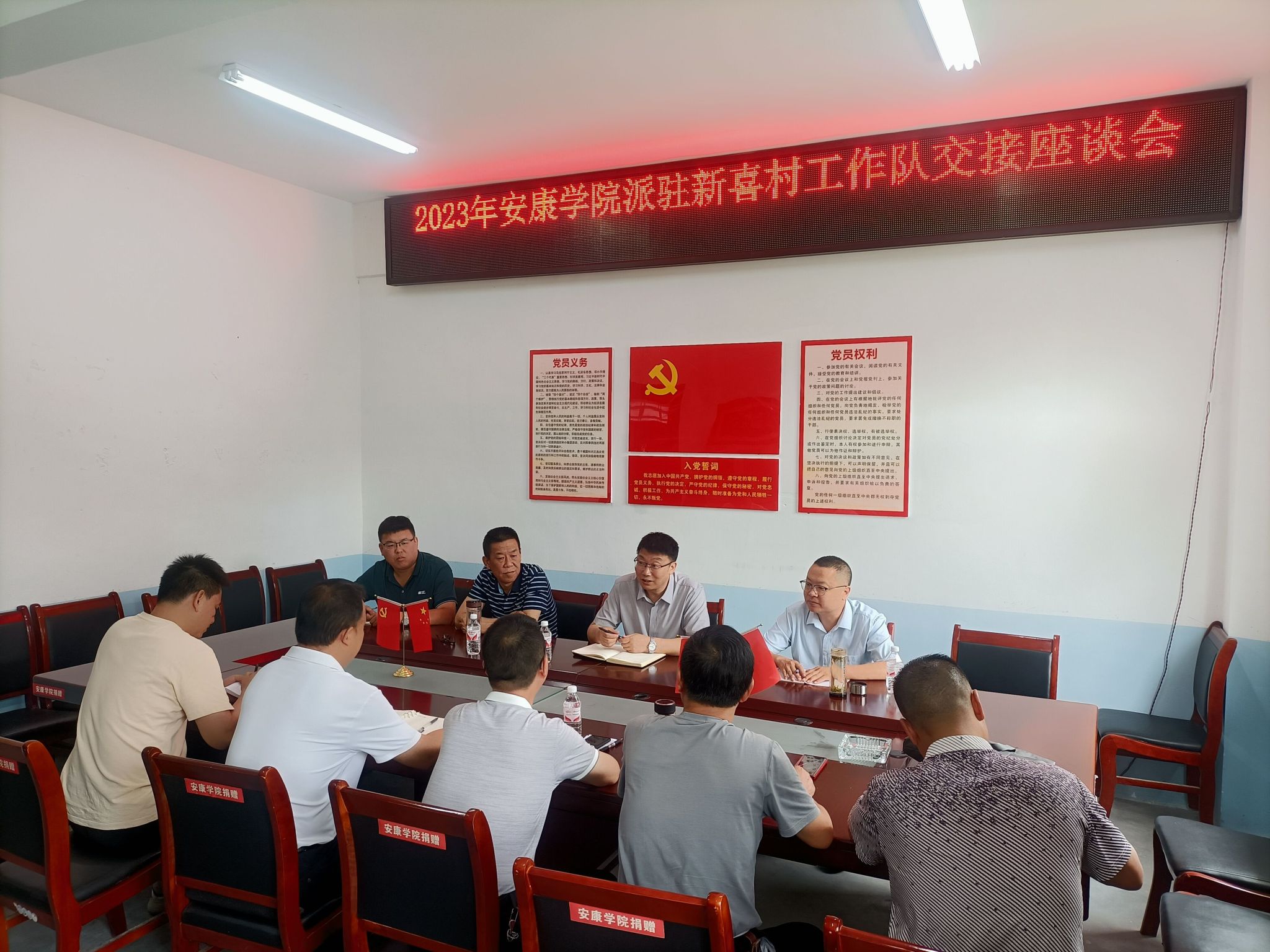张东红传达了2023年7月7日校党委会关于调整ac米兰驻岚皋县民主镇新喜村第一书记及工作队员的研究决定,原驻村工作队在任期内履职尽责,圆满完成了各项工作任务,按期进行轮换,新一届驻村工作队由赵海担任驻村第一书记,常江担任驻村工作队员,即日起进行为期一个月的压茬交接。