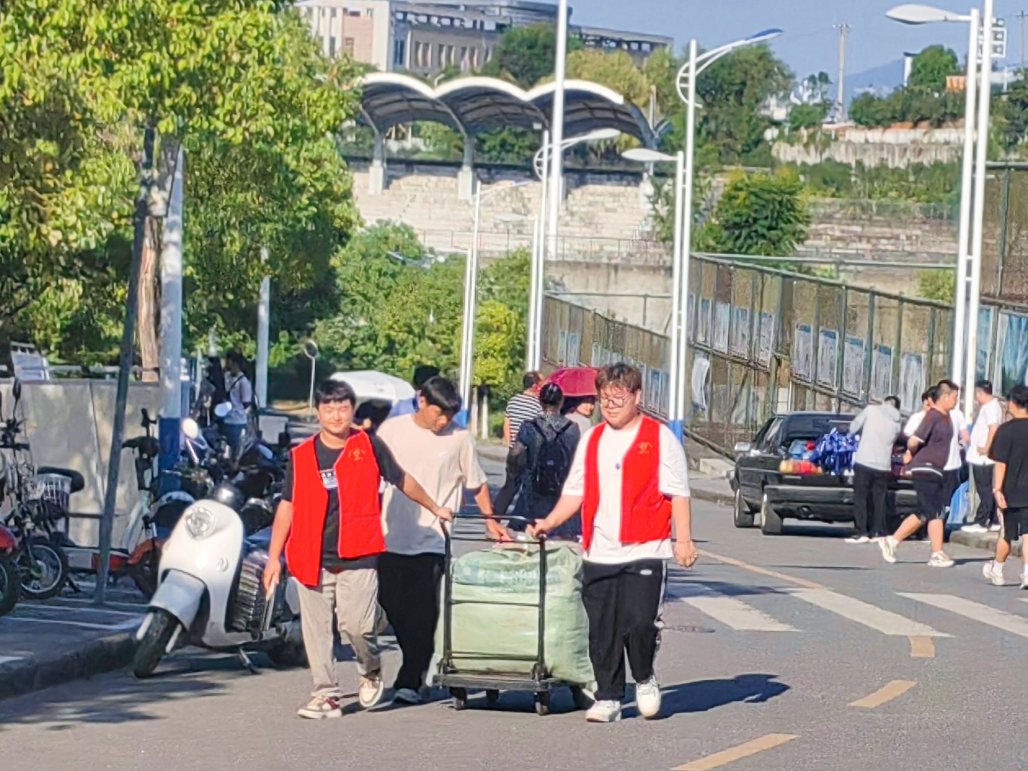 真诚服务,细致入微,让新生更“安心”。学校组织师生在火车站、高客站开展新生接站工作,暖心护航新生报到第一站;校园摆渡车便捷高效助力迎新,运送新生及行李,打通入学报到“最后一公里”。在学校大门口,保安有条不紊地指挥车辆,组织新生和家长有序入校。“你先去报到,拿不了的行李有我们……”志愿者们各尽其职,热心地为新生引路,帮助新生提行李、办理入学手续等。